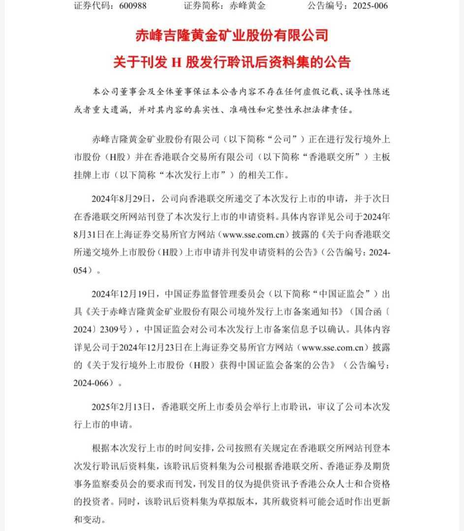 2024年12月,中国证监会出具了赤峰黄金境外发行上市备案通知书,对其本次发行上市备案信息予以确认。2月13日,香港联交所上市委员会举行了上市聆讯,审议了赤峰黄金的上市申请。聆讯后,赤峰黄金按照要求在香港联交所网站刊登了资料集。
