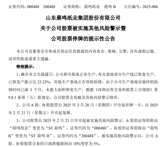 晨鸣纸业因生产基地未能恢复生产,将被实施其他风险警示,变更为“ST晨鸣”。公司正采取措施推进复工复产。