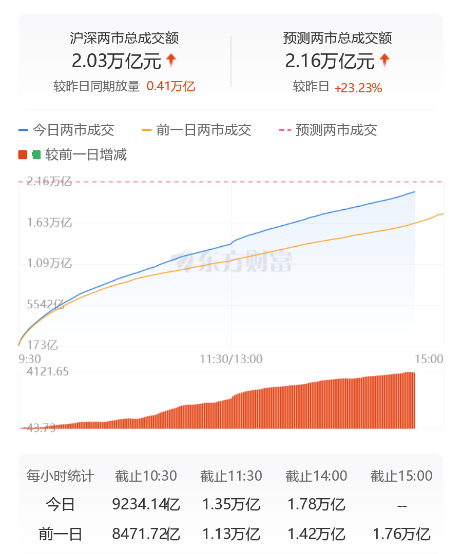 沪深两市成交额自2024年12月13日以来再度突破2万亿大关,较昨日此时放量超过4000亿,市场活跃度显著提升。