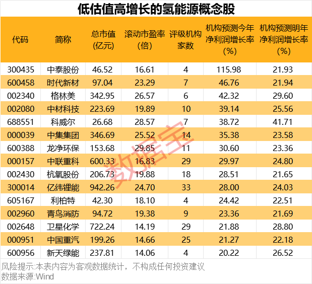 值得注意的是,部分低估值个股未来增长潜力获机构看好。根据3家以上机构一致预测,有15股今明两年净利润增速均有望超过20%,其中中泰股份今年业绩涨幅有望超过115%,进一步凸显了氢能源产业的投资前景。