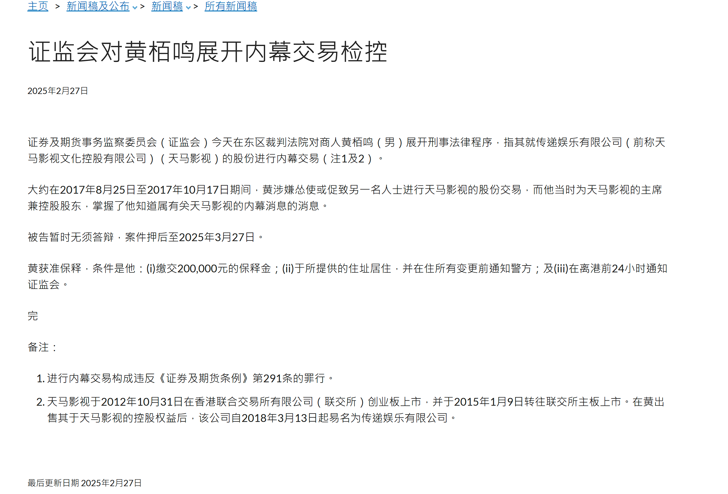 2025年2月27日,香港证监会一纸诉状将知名影人黄百鸣推上风口浪尖。这位曾打造《开心鬼》系列的“喜剧教父”,因涉嫌在担任天马影视(现名传递娱乐)控股股东期间怂恿他人内幕交易,被香港东区裁判法院启动刑事程序,并以20万港元保释候审,内幕交易案件引发市场广泛关注。