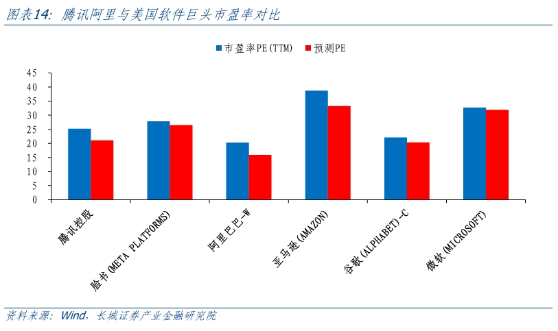 判断中国科技空间的关键指标是头部中概股估值修复。对比腾讯、阿里与美股M7中偏软件四家的估值,无论静态还是动态市盈率,腾讯、阿里估值较美股软件巨头仍有较大空间。