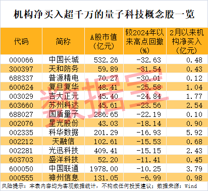 从资金流向来看,2月以来,机构资金净买入超千万元的量子科技概念股有14只,其中科华数据、中国联通等股票获机构净买入逾亿元。但部分股票回撤幅度较大,投资者需谨慎。