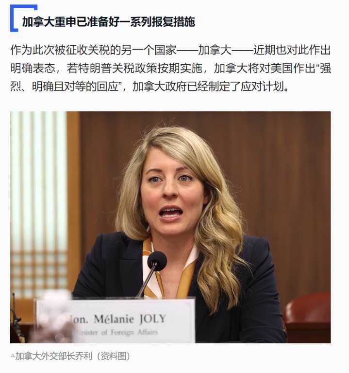 加拿大外交部长乔利表示,美国关税对加拿大而言是生存威胁,加拿大已准备好一系列报复性措施,首批将涉及价值300亿加元的美国产品。加拿大安大略省省长道格·福特警告,若美国继续推进加征关税,他将切断安大略省对美国的电力及其他能源出口。