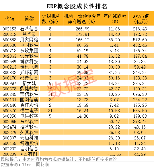 据证券时报·数据宝统计,A股市场ERP概念股合计有24只,市值接近5200亿元。其中,宝信软件、恒生电子、用友网络等个股市值均超500亿元。概念股年内平均涨幅超过20%,表明投资者对该板块前景看好。从机构预测来看,石基信息、易华录、用友网络等个股今年净利均有望翻倍增长。