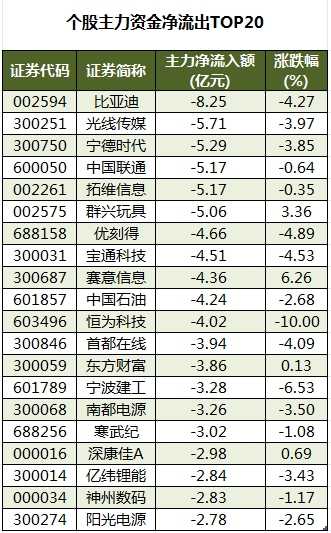 今日有3148只个股被主力资金净卖出,70股被主力资金净卖出超1亿元。比亚迪净流出最多。尾盘主力资金净卖出来看,宁德时代净流出最多。