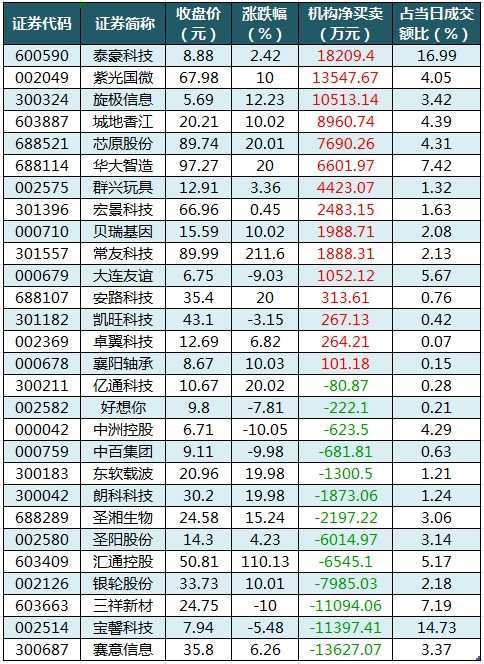 龙虎榜机构净买入15股,泰豪科技居首