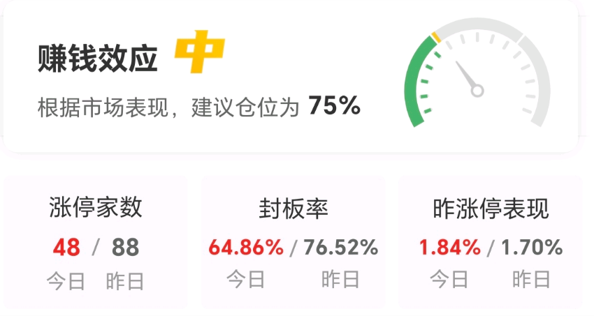 涨停个股数量方面,今日共有48只个股涨停,另有26只个股盘中一度触及涨停,整体封板率达到64.86%。