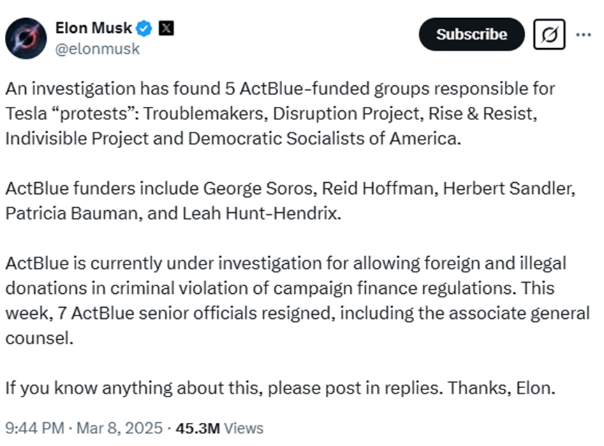 然而,马斯克认为这场看似由批评人士发起的民间自发行为背后另有深意。他在社交媒体上发帖指责民主党人士,包括亿万富翁索罗斯在内,是策划和支持特斯拉抗议活动的幕后推手。马斯克称,调查发现索罗斯和领英创始人Reid Hoffman等人通过民主党捐款机构ActBlue资助了五个特斯拉抗议团体。而ActBlue正因允许外国非法捐款而接受调查,这违反了美国的竞选财务规定。