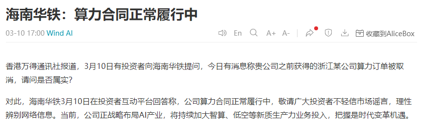 3月10日,有投资者在互动平台上向海南华铁求证,关于公司之前获得的浙江某公司算力订单被取消的传闻是否属实。海南华铁在互动平台明确回应,公司算力合同正在正常履行中,呼吁投资者不轻信市场谣言,理性辨别网络信息。目前,海南华铁正积极布局AI产业,计划加大智算、低空等新质生产力业务的投入,以期把握时代变革的机遇。
