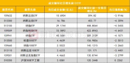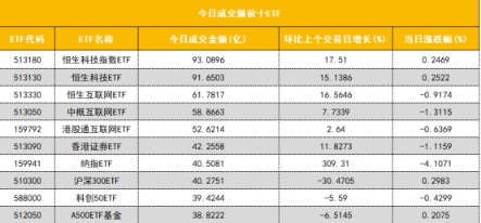 港股相关ETF成交活跃,恒生科技指数ETF(513180)成交额居首。纳指相关ETF成交额大增。