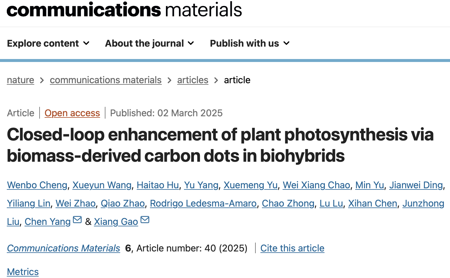 近期,中国科学院深圳先进技术研究院(简称“深圳先进院”)合成生物学研究所高翔团队联合上海交通大学杨琛团队,在《通讯-材料》上发表重要研究成果。他们成功研发出一种以农业废弃物生物质为原料合成的碳基纳米材料——碳量子点(CDs),并应用于增强植物的光合作用。据悉,《通讯-材料》是《自然》出版集团旗下专注于材料科学与通信技术交叉研究的国际学术期刊。