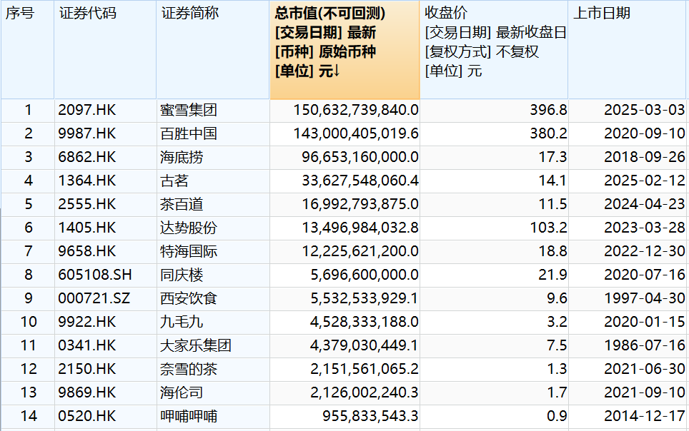 较昨日的股价回调之后,蜜雪集团(02097.HK)3月13日早盘股价略微回温,截至发稿,其总市值依然超越了百胜中国(09987.HK),位居中国餐饮类上市公司市值第一,成为餐饮股市的新焦点。
