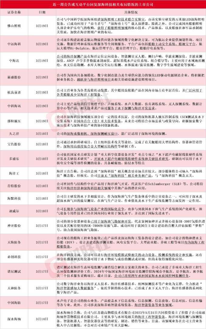 受政府工作报告利好消息刺激,深海科技概念股表现强劲,多家上市公司积极回应相关业务情况,显示出深海科技领域的巨大潜力和市场关注度。深海科技作为新兴产业,未来发展前景广阔。