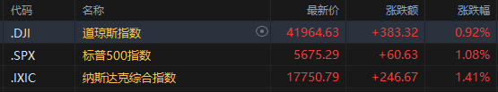 截至收盘,道琼斯指数报41,964.63点,上涨0.92%;标普500指数报5,675.29点,涨幅达1.08%;纳斯达克综合指数报17,750.79点,盘中一度涨超2%,最终收涨1.41%。