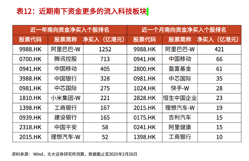 资金涌入是港股科技股上涨的重要推力。港股领跑全球权益市场,本质驱动力之一是港股“AI含量”高。从资金面上看,内外资都在重仓港股科技板块,推动科技巨头估值上涨。近期南向资金大规模涌入,且正从红利板块加速“调仓”至科技板块,为科技巨头市值上涨提供充足流动性支持。