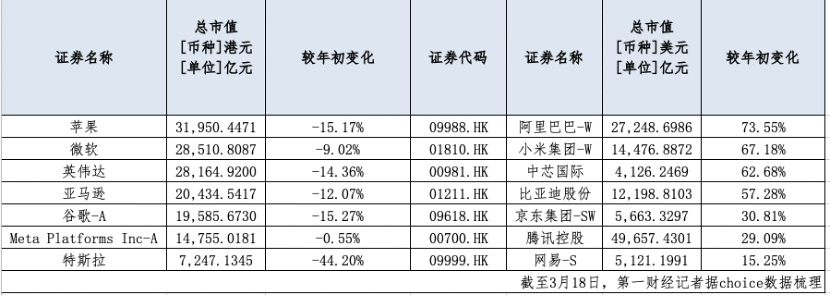 对比来看,美股科技“七姐妹”市值涨跌远低于港股。今年以来,美股科技七姐妹股票持续下跌。年初,市值合计为17.61万亿美元,3月18日收盘已下滑至15.06万亿美元,跌幅约14.48%。其中,特斯拉市值跌幅约44.2%,苹果、谷歌A市值跌幅也超15%。