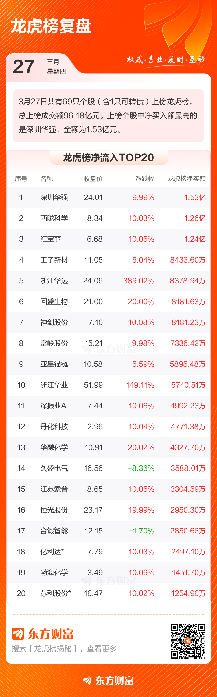 3月27日,股市交易活跃,共有69只个股(含1只可转债)荣登龙虎榜,总上榜成交额高达96.18亿元。其中,深圳华强以1.53亿元的净买入额领跑榜单,成为当日市场焦点。