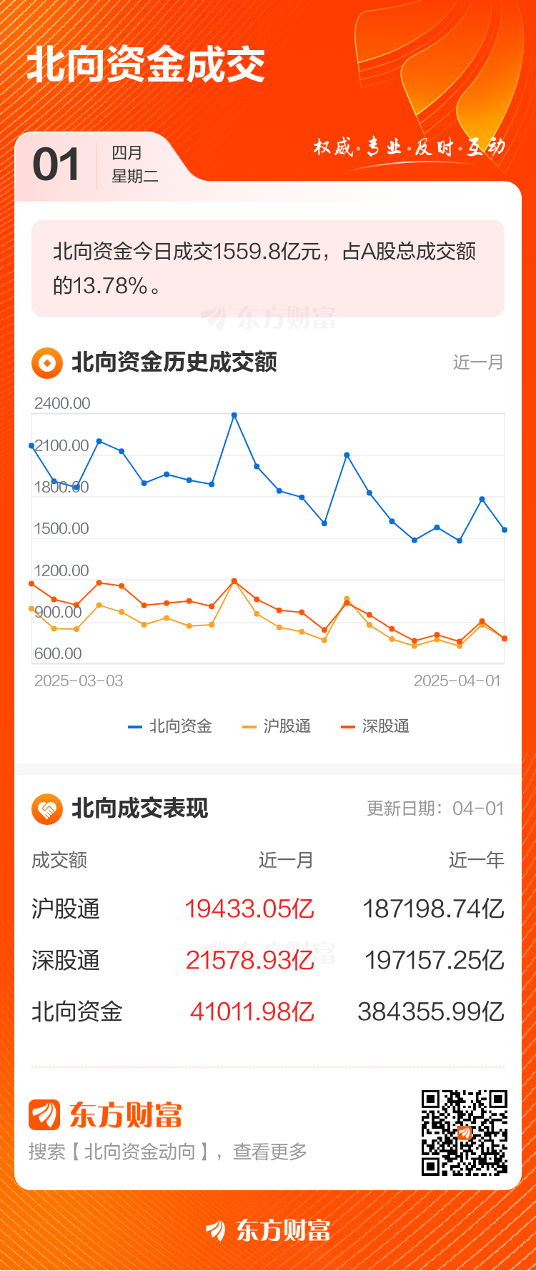 交易所最新数据显示,4月1日,北向资金共成交1559.80亿元,占比沪深两市总成交额的13.78%,显示出外资对A股市场的持续关注。其中,恒瑞医药、贵州茅台、宇通客车在沪股通成交中排名前三,成交额分别为22.35亿、9.09亿、7.66亿;而在深股通方面,比亚迪、宁德时代、北方华创位列前三,成交额分别达到18.16亿、13.50亿、9.75亿。这些热门个股的活跃交易,反映了市场对其业绩及未来发展的看好。