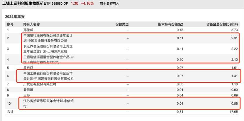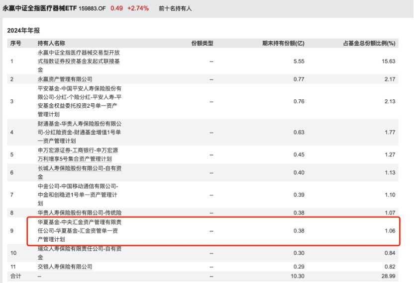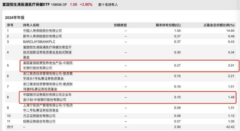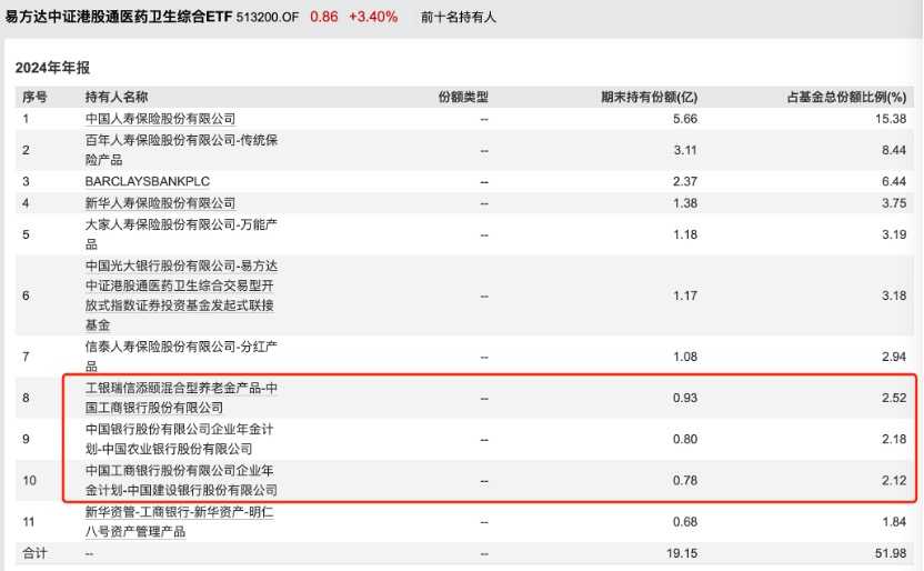 2024年底,国家队两大资管计划出现在易方达沪深300医疗卫生ETF和永赢中证全指医疗器械ETF的前十大持有人行列。此外,工银、富国和易方达旗下三只医疗主题ETF也被年金、养老金产品“抱团”。