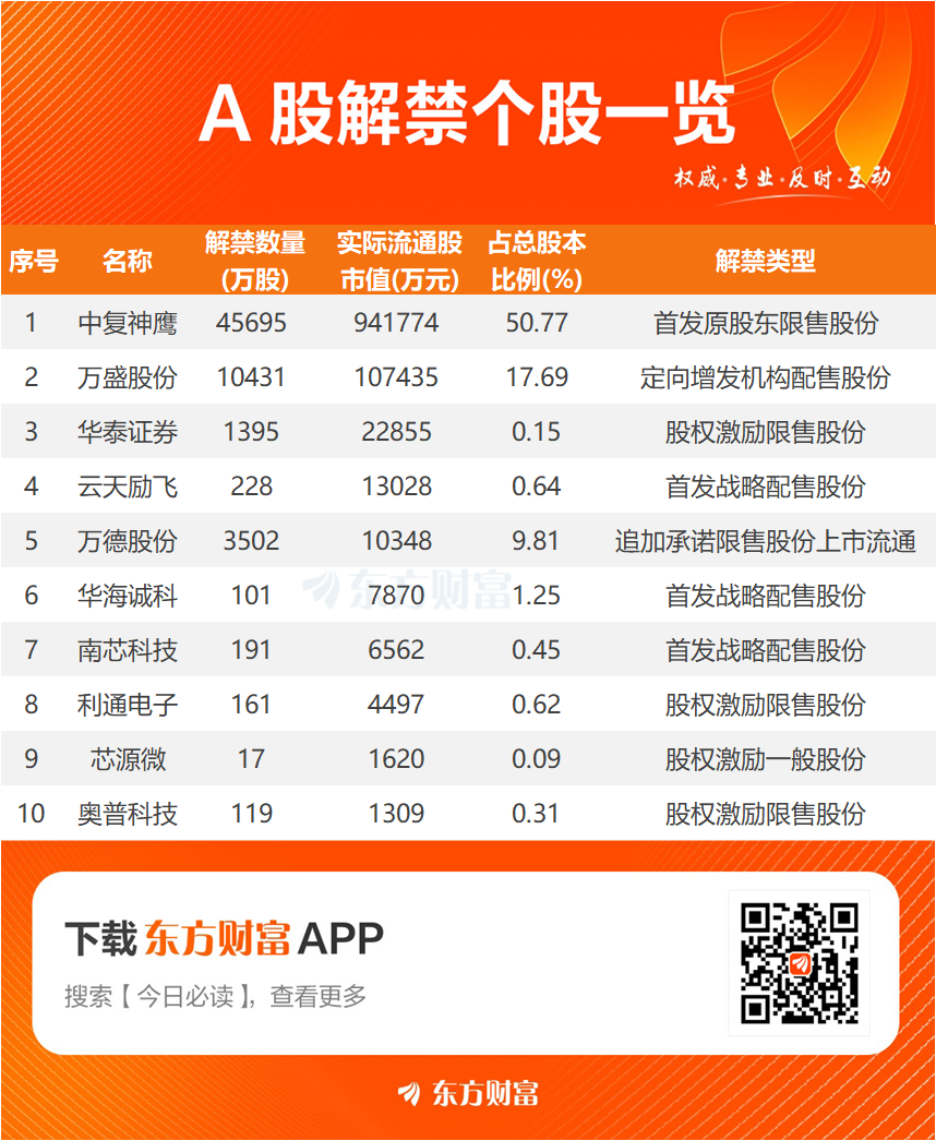 下周10股解禁市值达111亿,中复神鹰解禁居前
