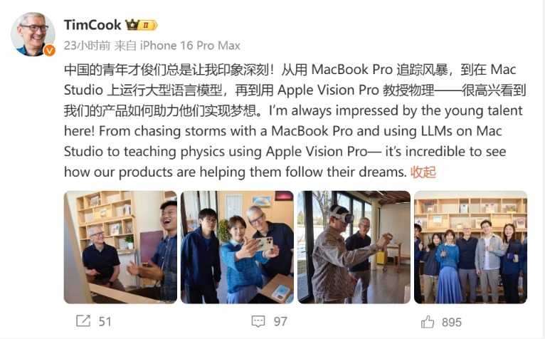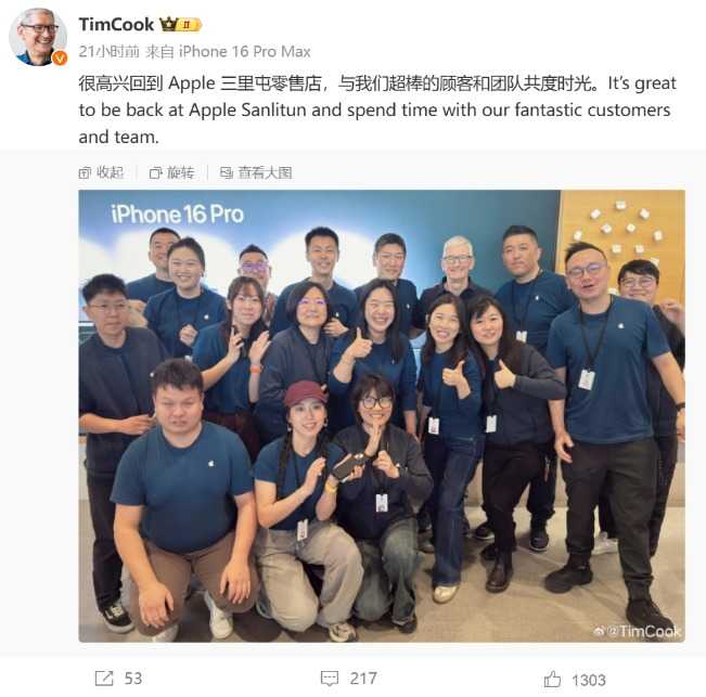 库克在3月25日现身三里屯苹果零售店,并在微博上发文称很高兴回到Apple三里屯零售店,与顾客和团队共度时光。同时,库克还表示中国的青年才俊让他印象深刻,苹果产品正在助力他们实现梦想。