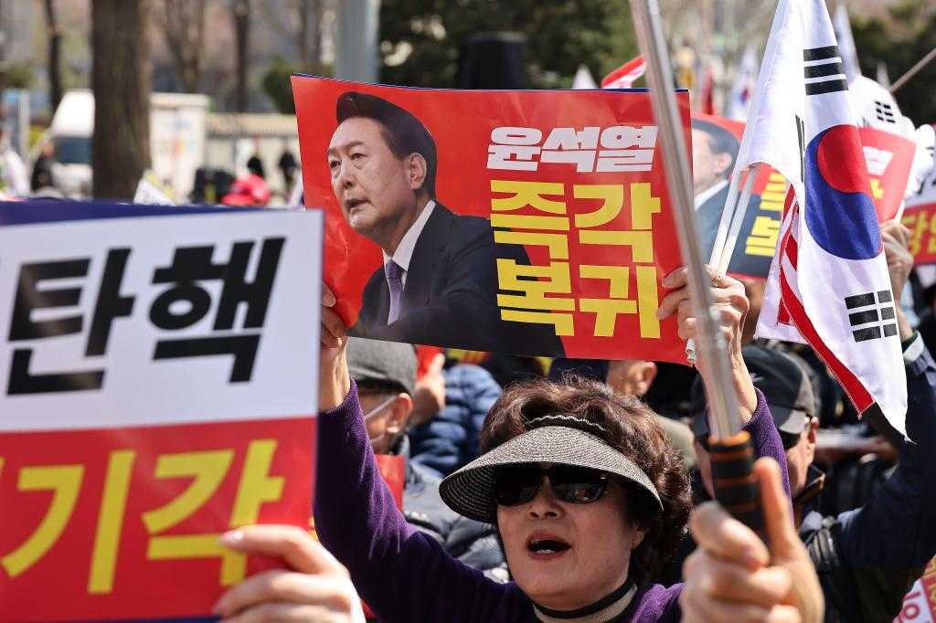 4月3日,韩国首尔,人们在宪法法院附近集会要求立刻罢免尹锡悦。新华社发(全休相摄)
