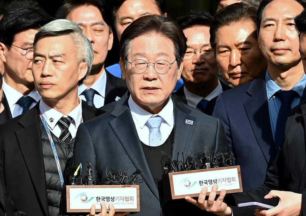 3月26日,韩国首尔高等法院,共同民主党党首李在明在二审被判无罪后发表讲话。新华社/纽西斯通讯社