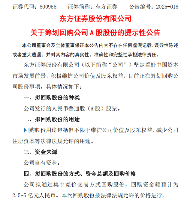 当日盘前,东方证券发布公告,公司坚定看好中国资本市场发展前景,积极维护公司价值及股东权益。为此,公司拟以2.5亿元至5亿元资金回购公司A股股份,回购价格不超过每股12元。这一举措体现了公司对市场的信心。