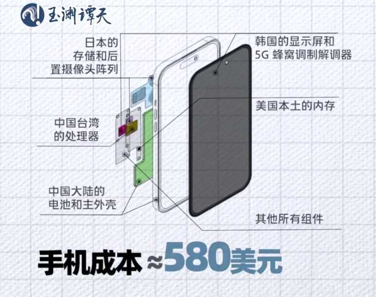 以一部256GB版本的iPhone 16 Pro为例,其官方售价为1100美元。据美国媒体的数据计算,苹果公司制作一部手机的硬件成本约为549.73美元。这些硬件来自中国、韩国和日本等多个国家,若再加上组装和测试费用,手机成本将接近580美元。