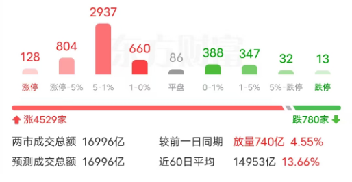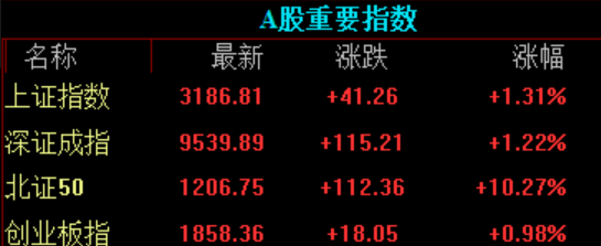4月9日,A股市场迎来普涨行情,三大股指集体收涨。上证指数报收3186.81点,涨幅达1.31%;深成指报收9539.89点,上涨1.22%;创业板指则报收1858.36点,上涨0.98%。市场氛围积极,逾4500只股票上涨。