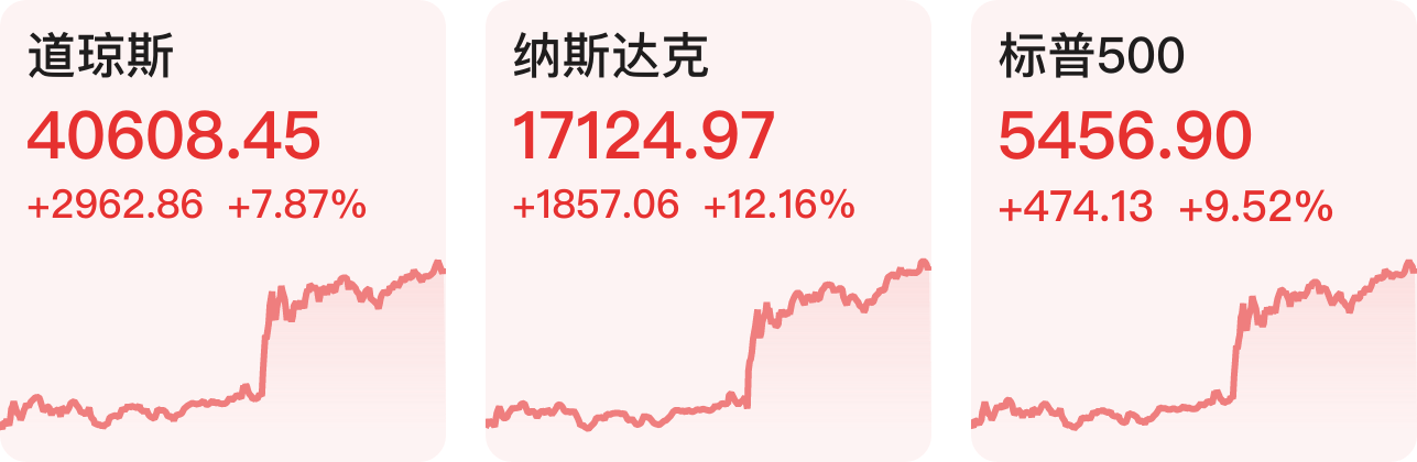 美股三大指数收盘集体大涨,纳指涨12.16%,标普500指数涨9.52%,道指涨7.87%。大型科技股大幅走高,特斯拉涨超22%,英伟达涨超18%,苹果涨超15%。纳斯达克中国金龙指数收盘涨4.53%。热门中概股集体走高,爱奇艺涨超12%,理想汽车、哔哩哔哩、京东、小鹏汽车涨超6%。股市热点再现。