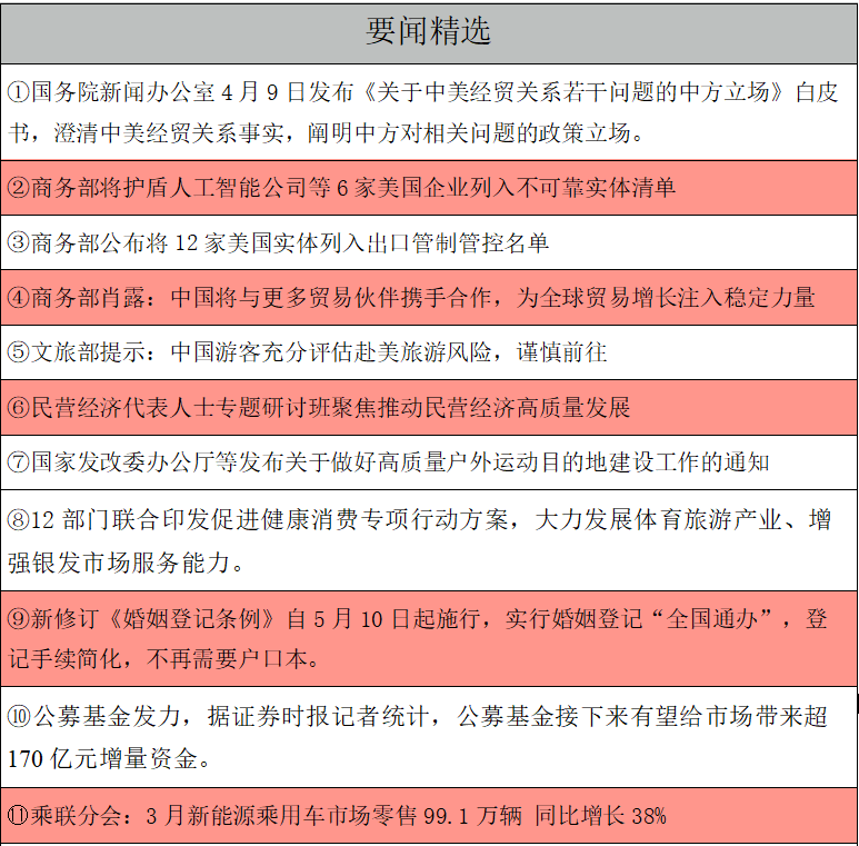 【摘要】坚决反制!中国对原产于美国进口商品加征84%关税;欧盟投票通过对美征收25%关税反制措施;《关于中美经贸关系若干问题的中方立场》白皮书发布;文旅部提示:中国游客充分评估赴美旅游风险,谨慎前往;北京市国资委:国有股东按市场化原则适时增持股票,具备条件的上市公司有计划实施股票回购;四川省国资委:支持监管企业和上市公司依法合规用好用足市值管理政策和工具;美股三大指数集体大涨,纳指涨超12%,纳斯达克中国金龙指数涨4.53%,特斯拉涨超22%。