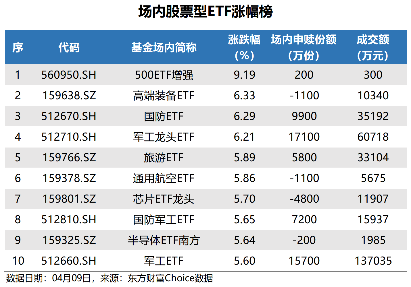 数据显示,昨日场内股票型ETF中,500ETF增强、高端装备ETF、国防ETF位居涨幅前列,其中500ETF增强表现最佳,涨幅高达9.19%。