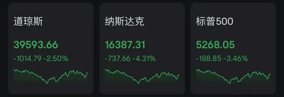当地时间4月10日,美股三大指数大幅回落。截至收盘,道指跌1014.79点,跌幅2.50%;纳指跌737.66点,跌幅4.31%;标普500指数跌188.85点,跌幅3.46%。