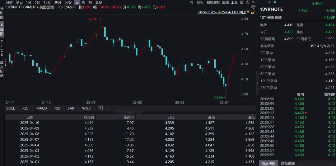 债市方面,美国国债再遭抛售。Wind数据显示,4月10日,美国10年期国债收益率上涨1.84%,收报4.419%。拉长时间周期看,美国10年期国债收益率自4月4日起大幅走高。