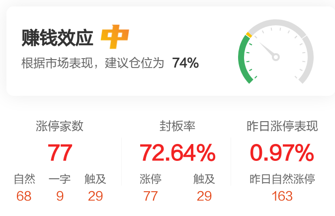 涨停个股数量方面,今日共计77股涨停,另有29只个股盘中一度触及涨停,封板率达到72.64%,市场活跃度较高。