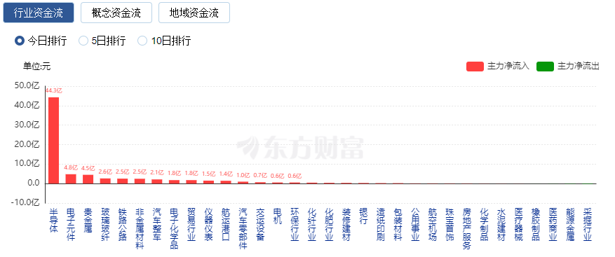 行业资金流向显示,半导体、电子元件等净流入排名靠前,半导体净流入额尤为显著。净流出方面,农牧饲渔、商业百货等板块排名靠前。