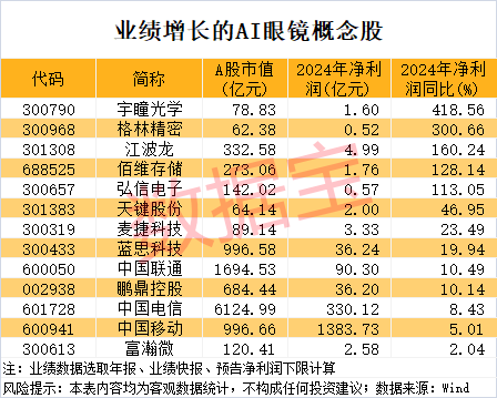 截至4月14日收盘,AI眼镜概念股今年以来平均下跌10.19%,跑输同期上证指数。但业绩方面,2024年净利润同比增长的AI眼镜概念股有13只,其中江波龙、佰维存储等扭亏为盈。
