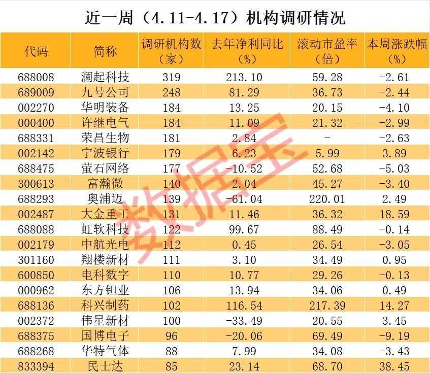 九号公司、华明装备、许继电气、荣昌生物等个股同样吸引了超过百家机构的调研。其中,大金重工、科兴制药股价本周表现尤为突出。大金重工一周内股价涨幅超过18%,创年内新高,受益于出口海工产品的高附加值,公司归母净利润同比增长11.46%,经营性现金流量净额连续三年持续增加。