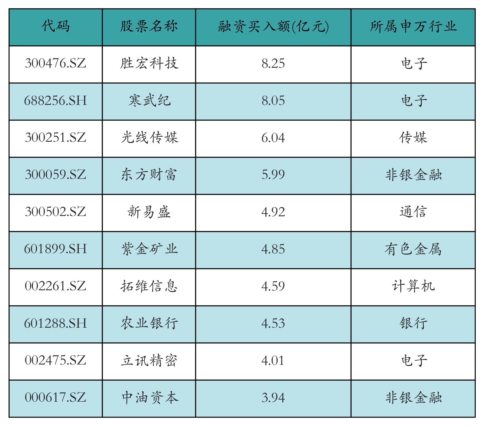 两市共有3423只个股获融资资金买入,胜宏科技、寒武纪、光线传媒位列前三,融资买入额分别为8.25亿元、8.05亿元、6.04亿元。具体详情见下表: