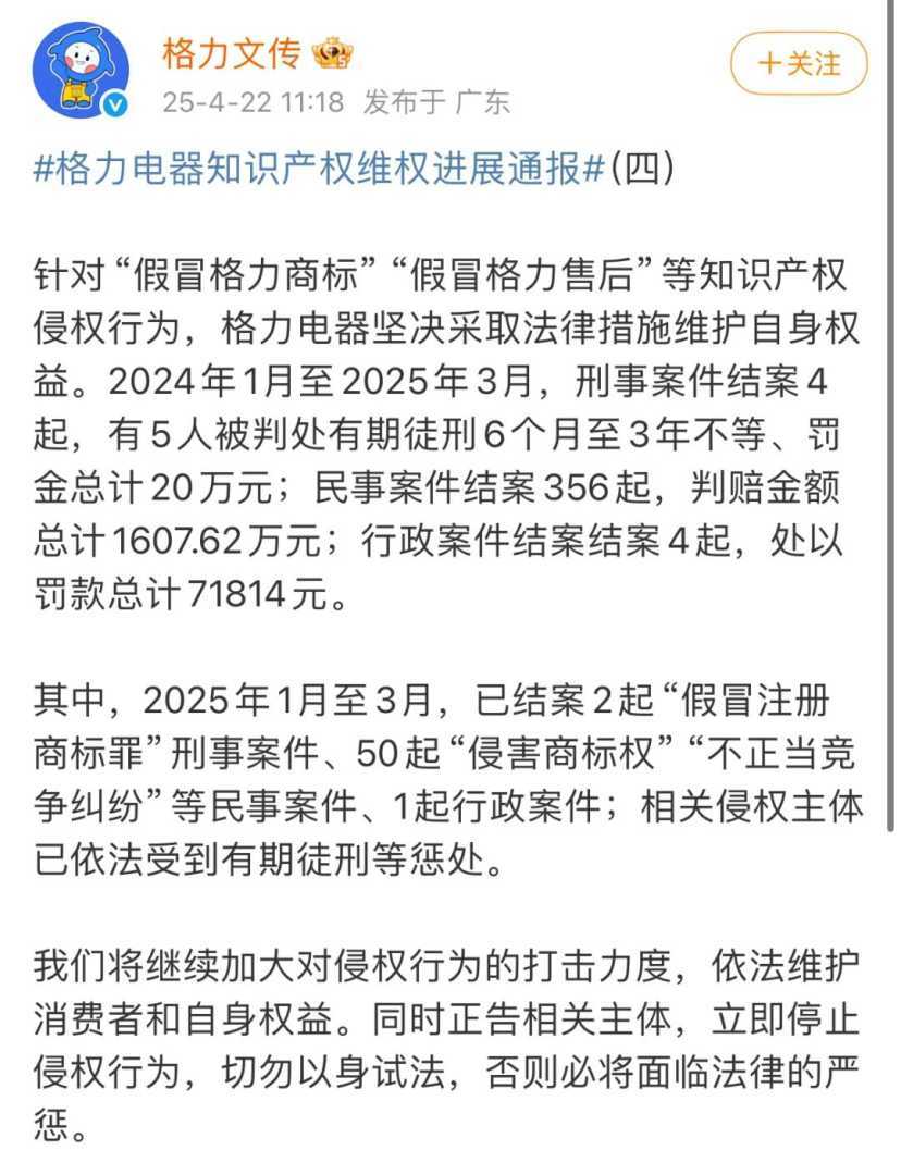 4月22日,格力电器(000651)文化传媒中心通过其官方微博号@格力文传发布知识产权维权进展通报。通报显示,自2024年1月至2025年3月期间,格力电器针对“假冒格力商标”、“假冒格力售后”等知识产权侵权行为展开了一系列法律行动,取得了显著成果。
