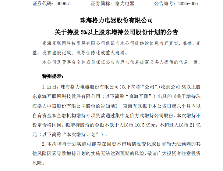 公告显示,京海互联本次拟增持股份的金额不低于10.5亿元,不超过21亿元。本次增持计划不设定价格区间,将综合考虑公司股票的内在价值、市场价格走势等因素,确保增持行为合理公平。