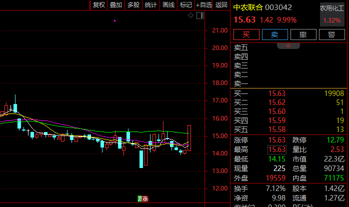 市场热点方面,农业股全线走强,虫害防治方向领涨,板块指数高开高走,放量大涨3.5%。多只农业股涨停,包括美邦股份、中农联合等。