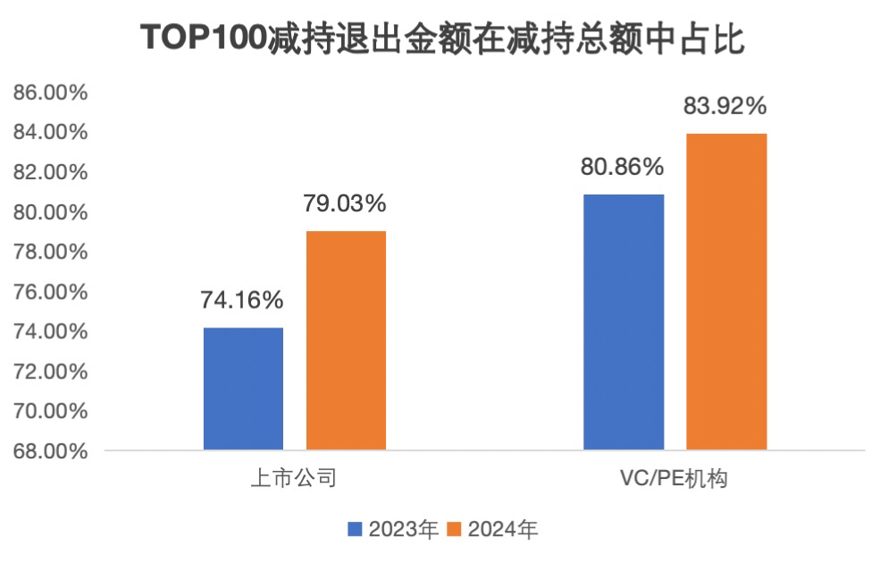 尽管整体退出规模下降,但头部机构的效应愈发显著。《报告》显示,2024年316家VC/PE机构中,减持金额TOP100的机构占比31.65%,却贡献了84.07%的累计减持退出金额,减持笔数TOP100的机构也占据主导地位。这凸显出优质项目和头部机构在退出事件中的重要性。