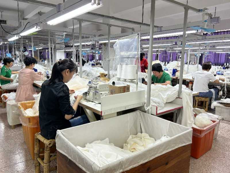 婚纱晚礼服知名企业广东名瑞(集团)股份有限公司生产车间内,女工们正忙着操控缝纫机,为即将到来的美国订单赶工。