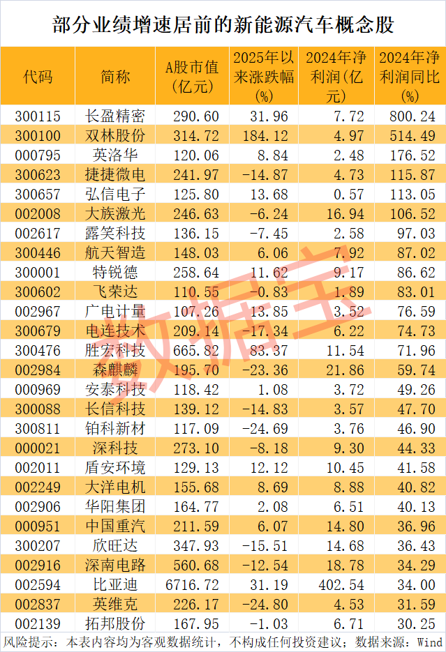 随着2024年年报披露进入尾声,新能源汽车产业链公司业绩备受关注。据证券时报·数据宝统计,已披露年报的新能源汽车概念股中,接近半数公司2024年净利润同比增长(含扭亏为盈)。截至4月25日收盘,A股市值在百亿元以上的概念股中,6家公司2024年净利润翻倍增长,分别为长盈精密、双林股份、英洛华、捷捷微电、弘信电子、大族激光。