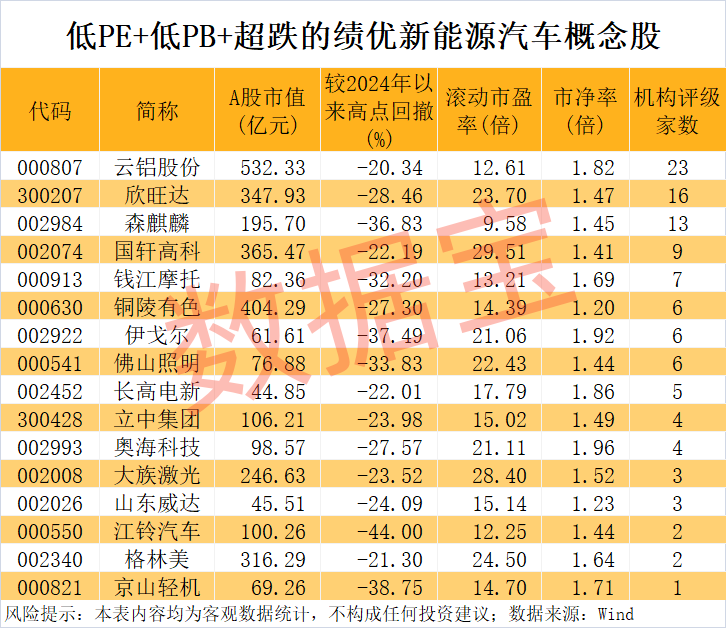 从估值水平来看,截至4月25日收盘,上述业绩增长的新能源汽车概念股中,最新收盘价较2024年以来高点回撤20%以上,且滚动市盈率(PE)低于30倍、市净率(PB)低于2倍的有16股。