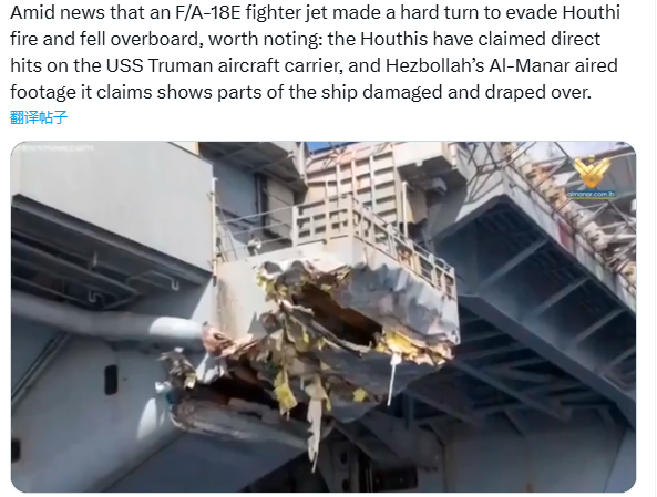 在胡塞武装提供的真假未知的视频里,杜鲁门号的部分部件甚至出现受损并被覆盖。这也进一步加剧了此次事件的复杂性。
