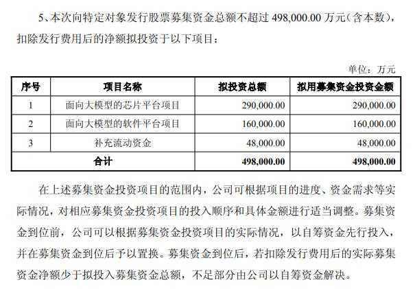 寒武纪公告,拟定增募资不超过49.8亿元,这笔资金将主要用于面向大模型的芯片平台项目、面向大模型的软件平台项目以及补充流动资金。此举旨在进一步加强公司在人工智能芯片领域的竞争力,推动技术创新与发展。